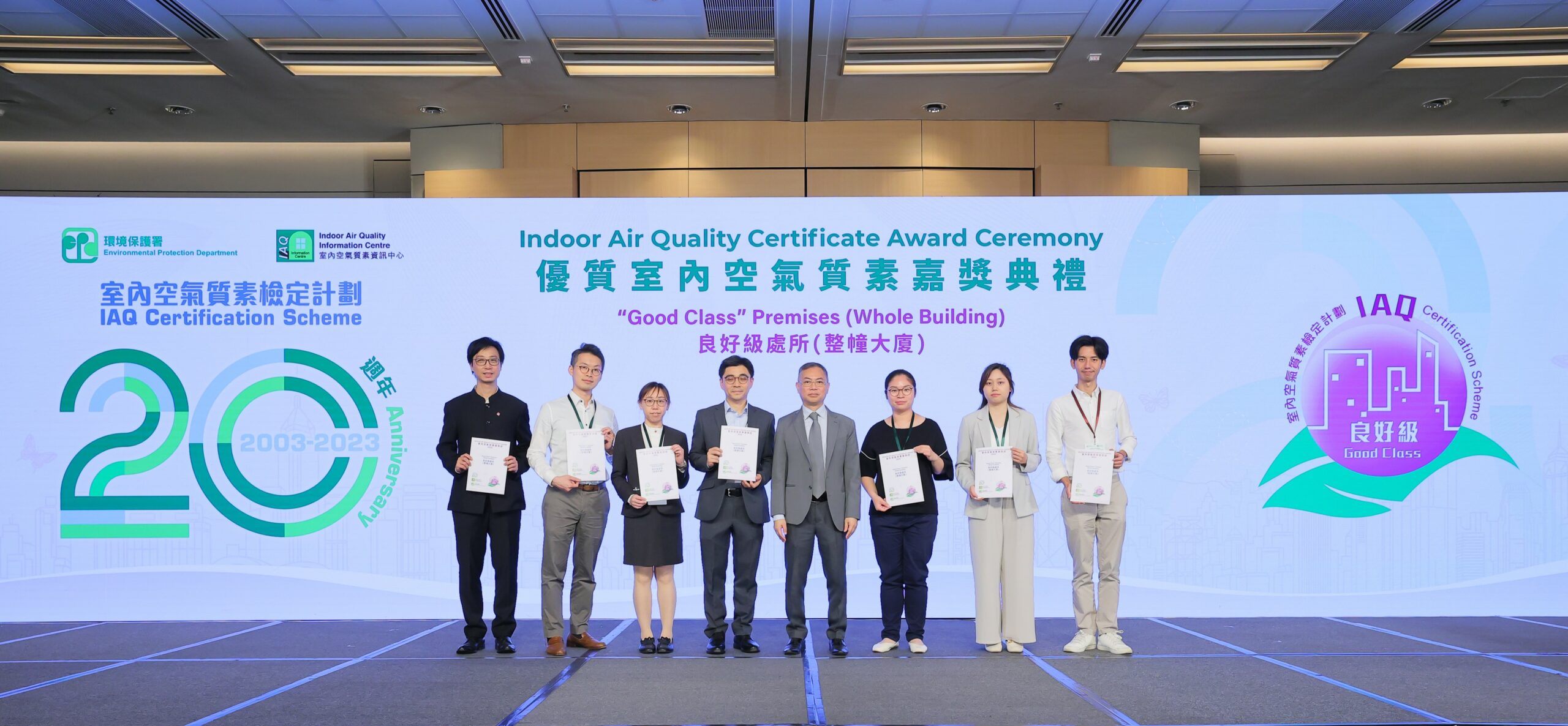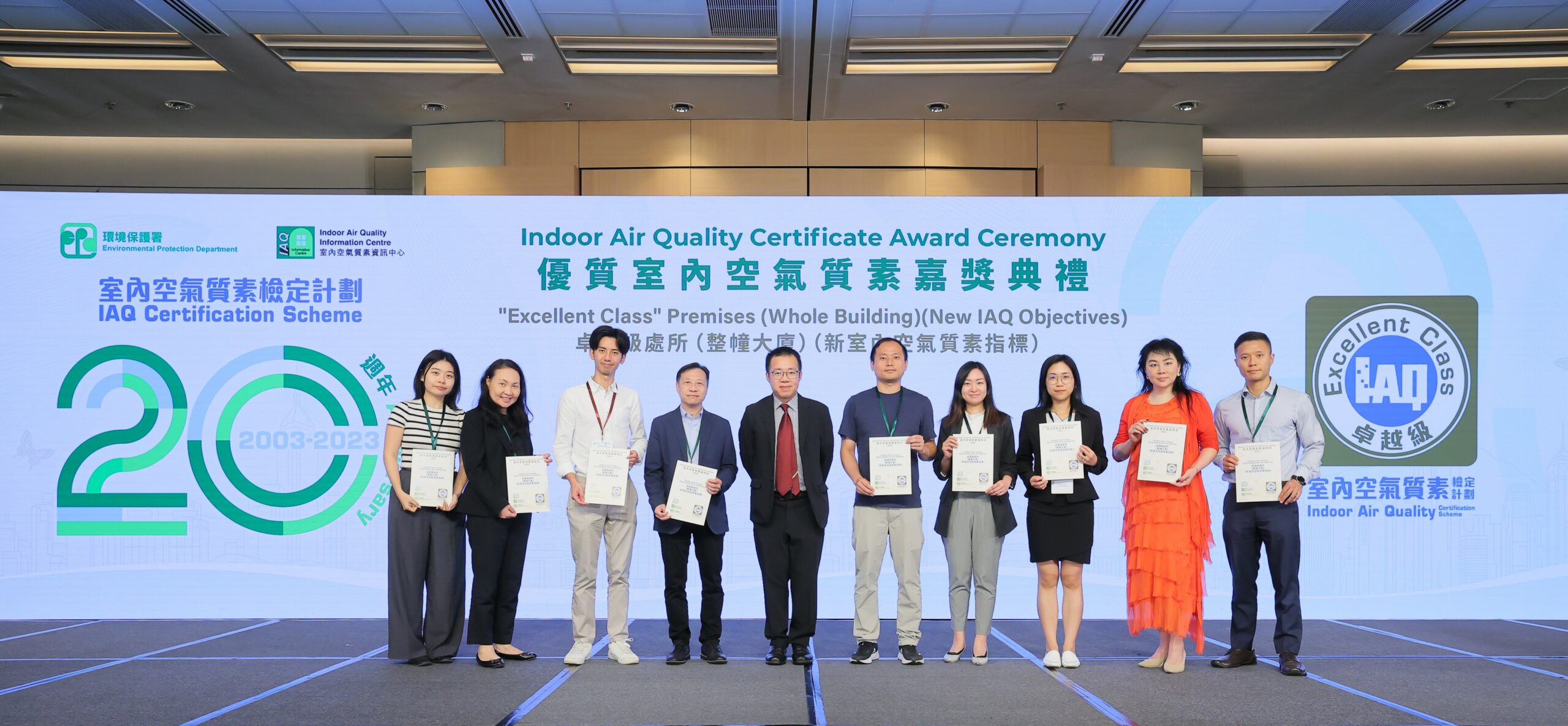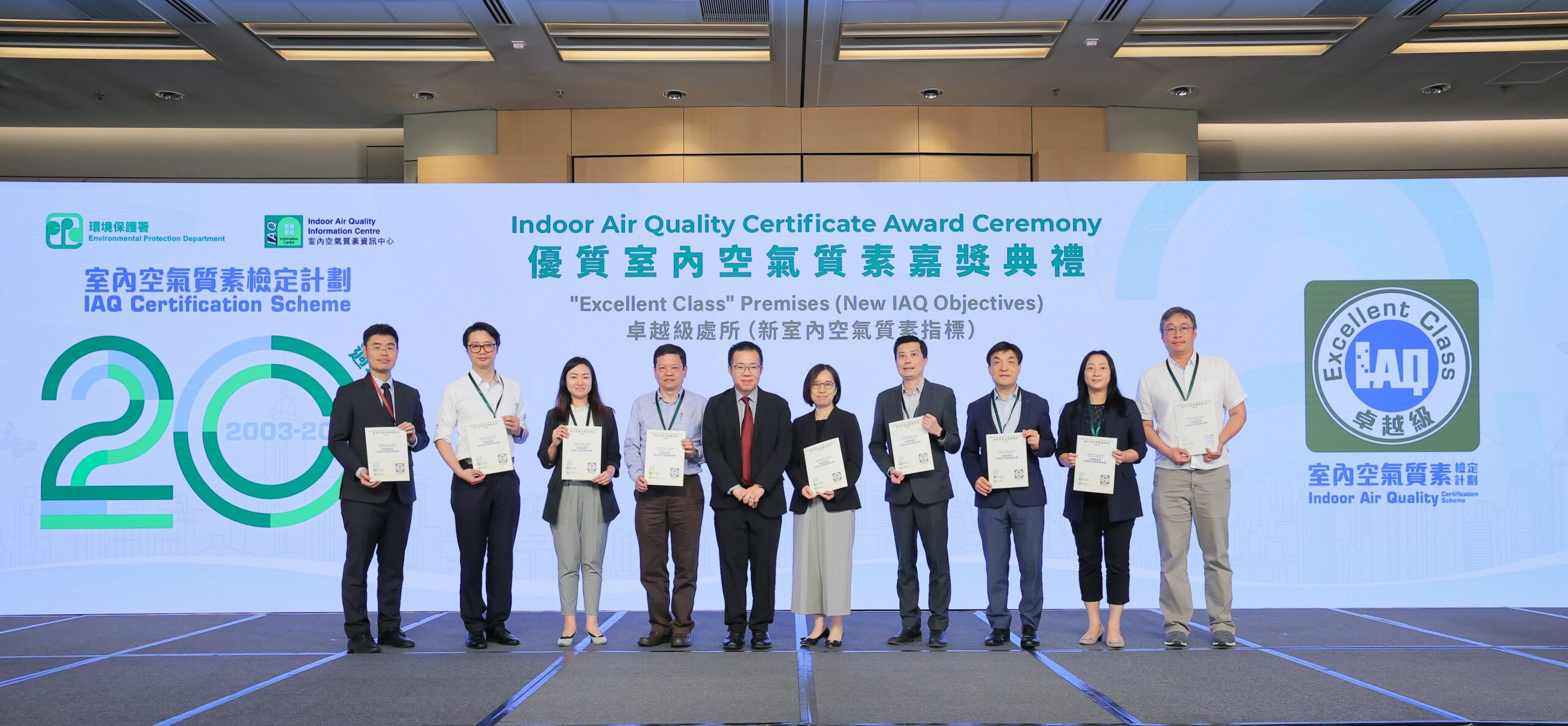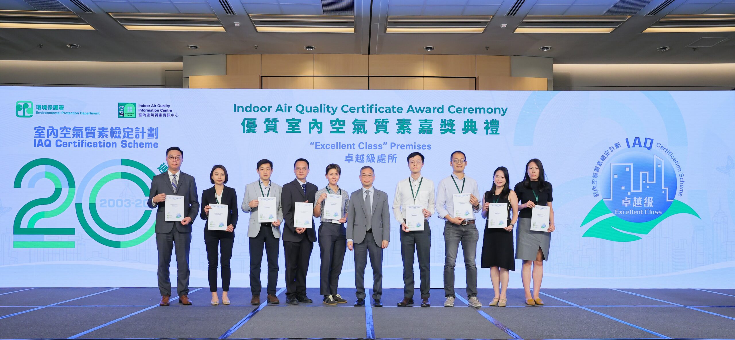 環境保護署(環保署)於二零二四年五月八日舉行「優質室內空氣質素嘉獎典禮」,慶祝「室內空氣質素檢定計劃」(檢定計劃)推行二十年,並表揚逾1 000個處所在過去一年致力提升室內空氣質素,當中635個處所的室內空氣質素獲檢定為「卓越級」, 284個處所獲檢定為「良好級」。持續參與檢定計劃達十年、十五年或二十年的處所及參與率最高的十個機構獲頒發特別嘉許狀,以感謝他們對提升室內空氣質素的支持及貢獻。