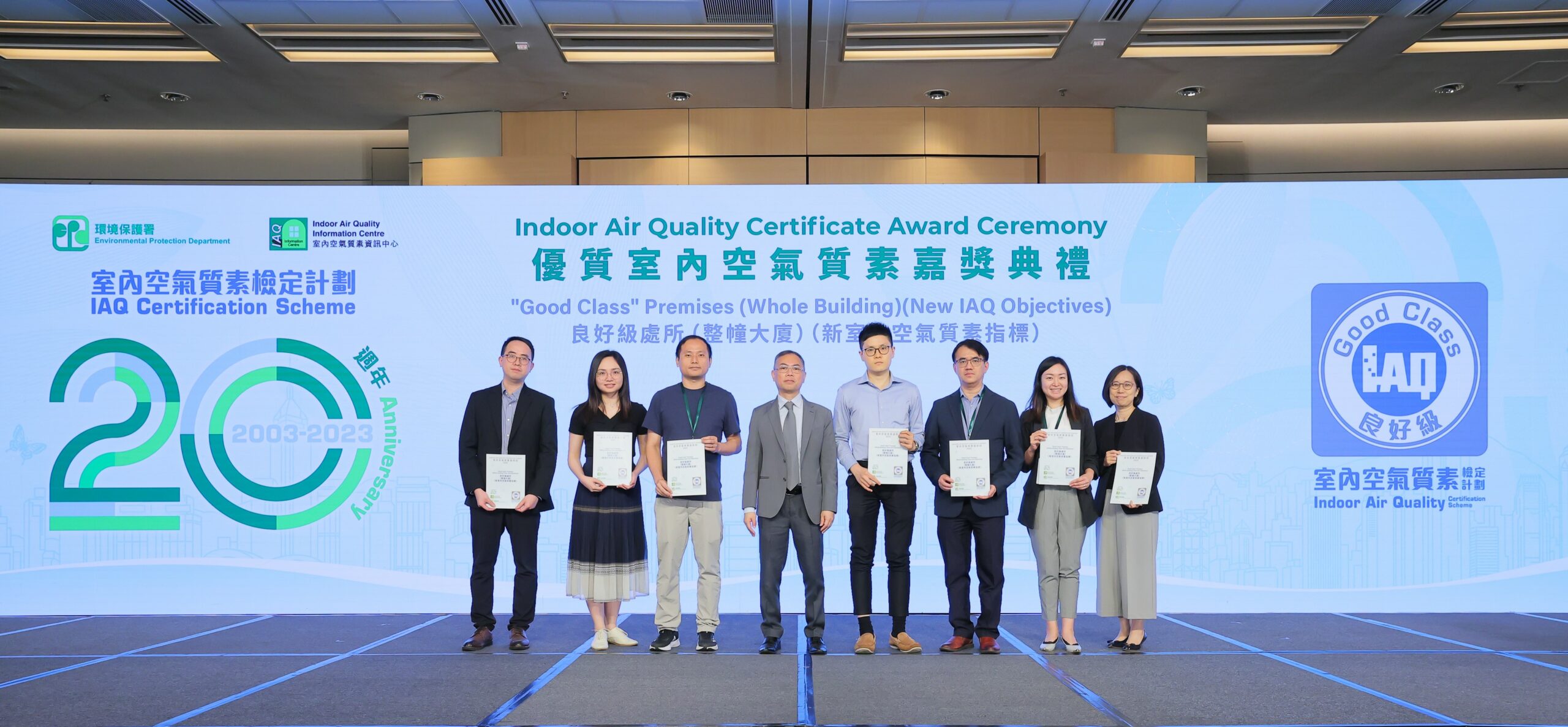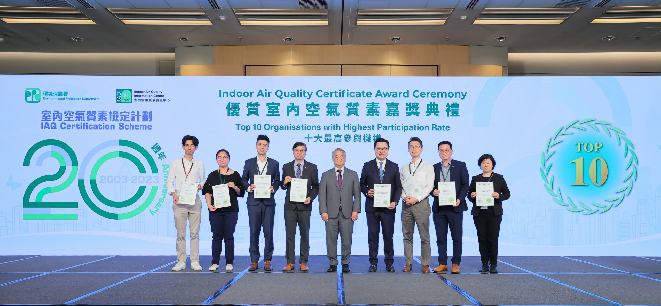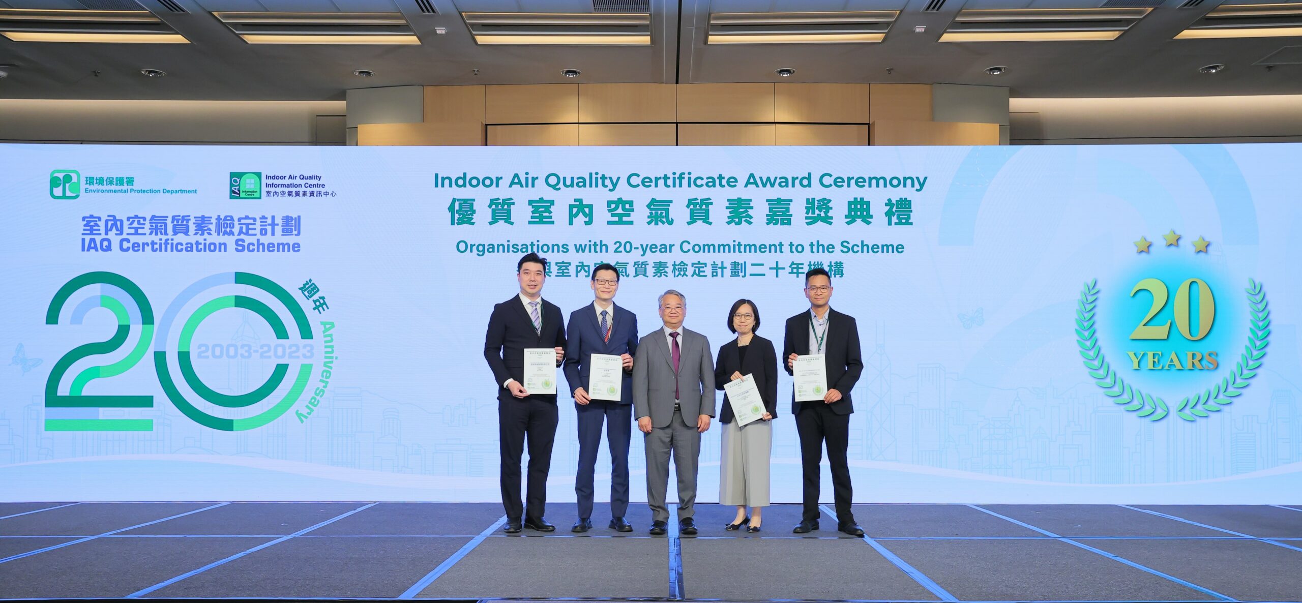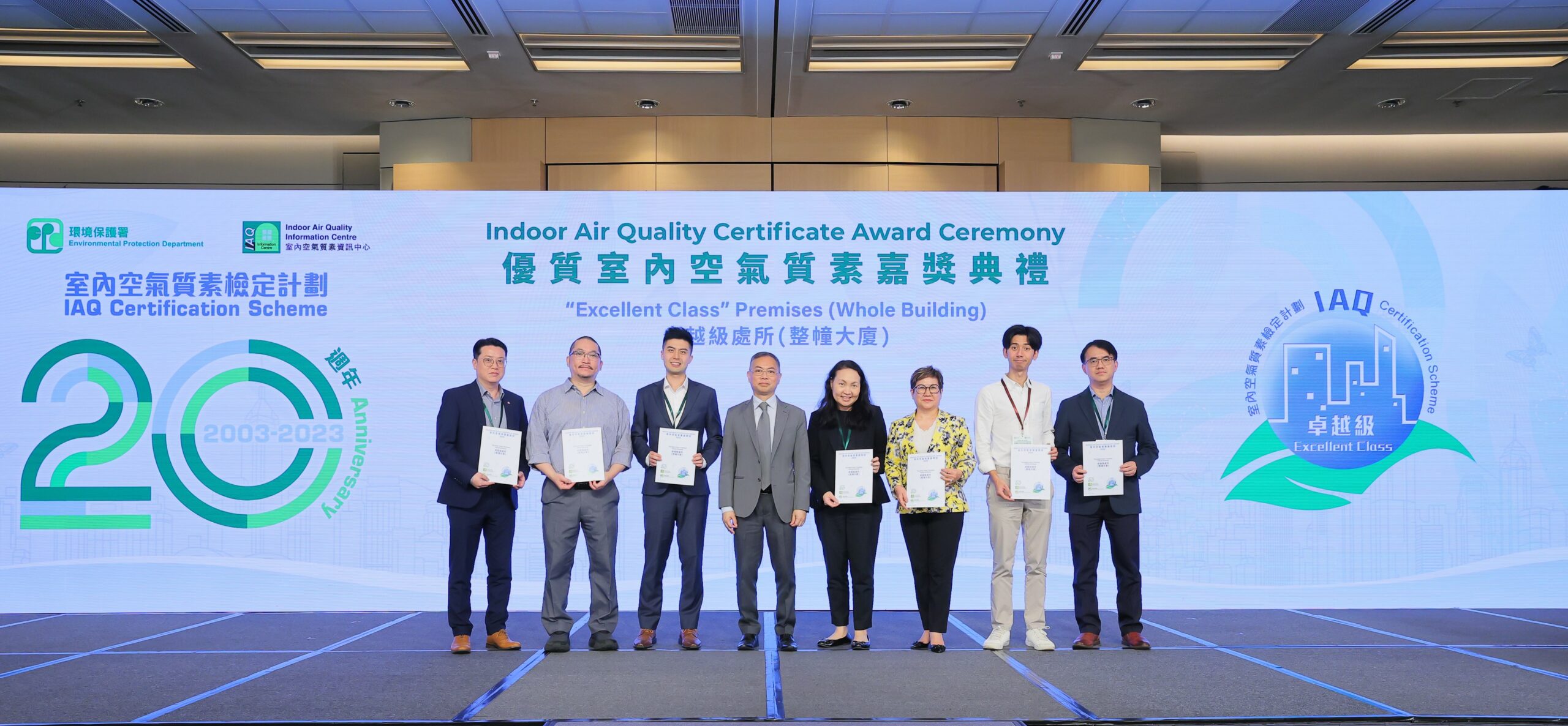 環境保護署(環保署)於二零二四年五月八日舉行「優質室內空氣質素嘉獎典禮」,慶祝「室內空氣質素檢定計劃」(檢定計劃)推行二十年,並表揚逾1 000個處所在過去一年致力提升室內空氣質素,當中635個處所的室內空氣質素獲檢定為「卓越級」, 284個處所獲檢定為「良好級」。持續參與檢定計劃達十年、十五年或二十年的處所及參與率最高的十個機構獲頒發特別嘉許狀,以感謝他們對提升室內空氣質素的支持及貢獻。